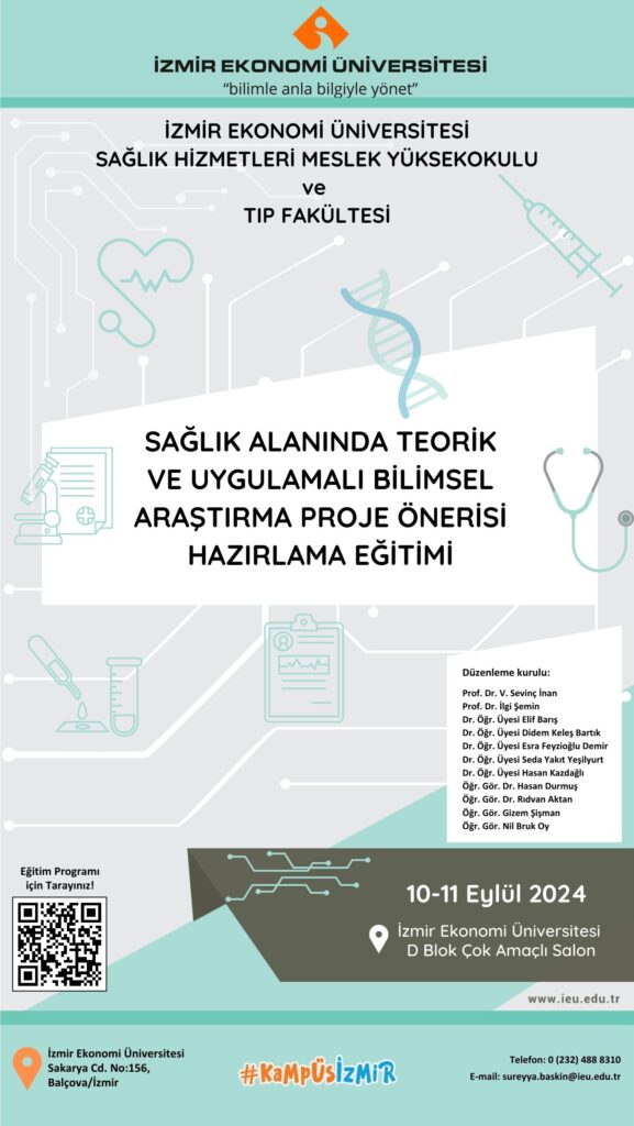 İzmir Ekonomi Üniversitesi Sağlık Hizmetleri Meslek Yüksek Okulu ve Tıp Fakültesi tarafından 10-11 Eylül 2024 tarihleri arasında düzenlenecek ‘‘Sağlık Alanında Teorik ve Uygulamalı Bilimsel Araştırma Proje Önerisi Hazırlama Eğitimi’’ne hepiniz davetlisiniz.